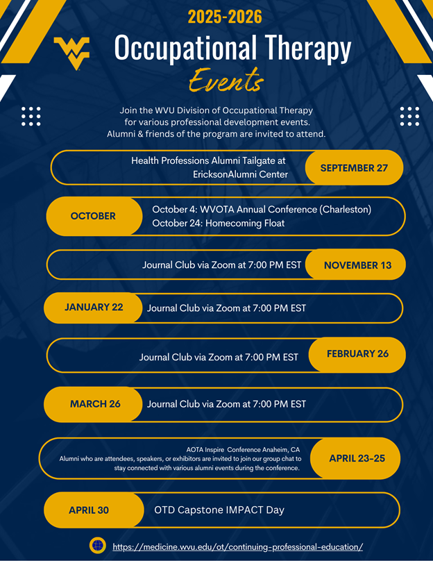 The Division of Occupational Therapy at West Virginia University provides multiple continuing education events for occupational therapy professionals. We offer courses both onsite and online at the University as well as serve as faculty for courses that are offered throughout the state and the country.