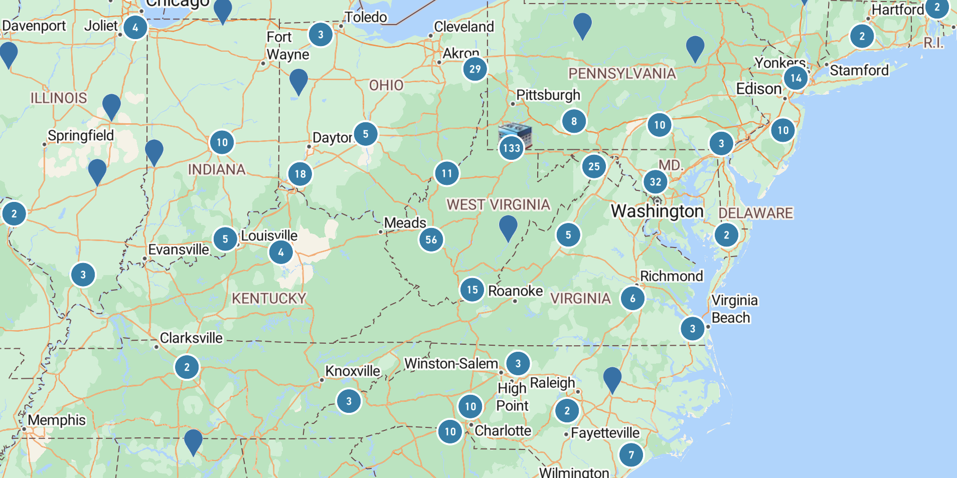This map highlights the current available regional fieldwork sites that WVU OT students can choose from. Additional nationwide sites are also available beyond the region. A total of 469 sites are available.